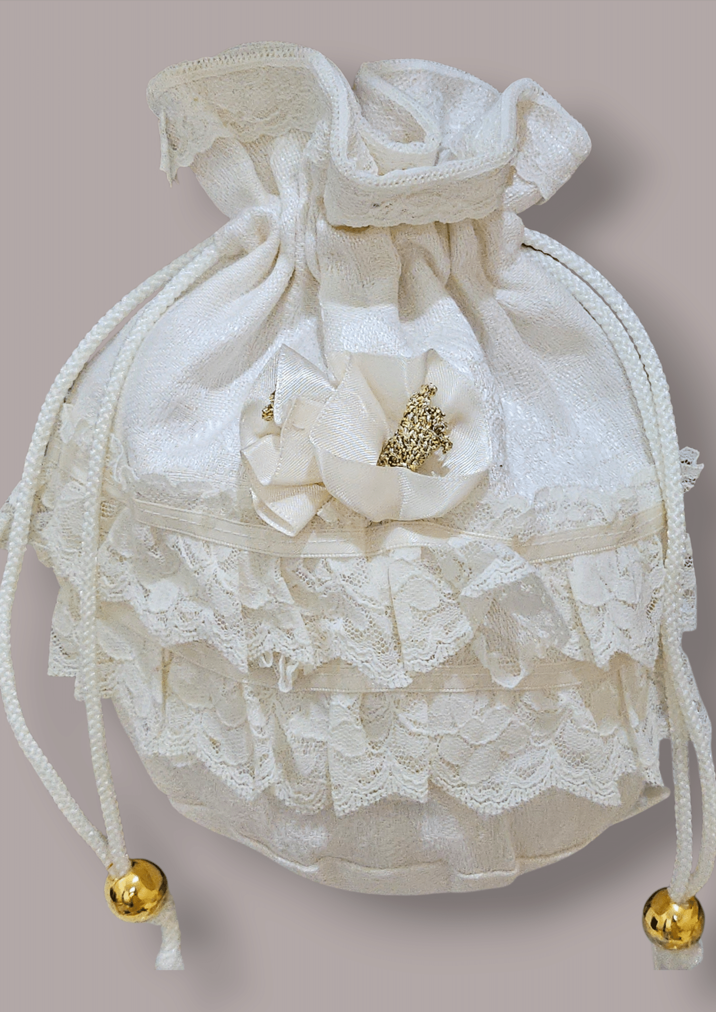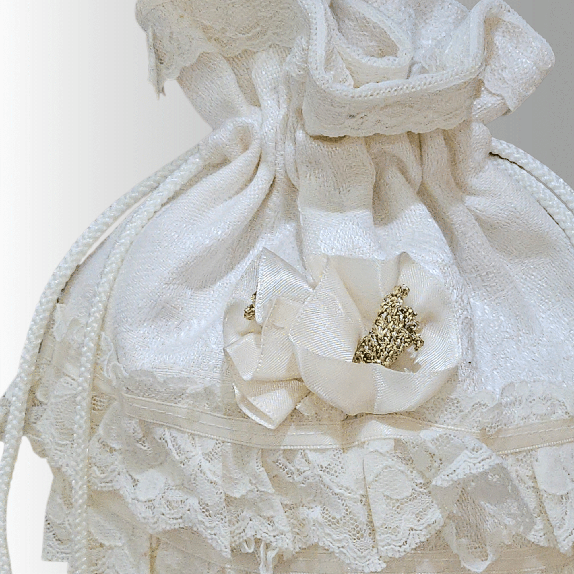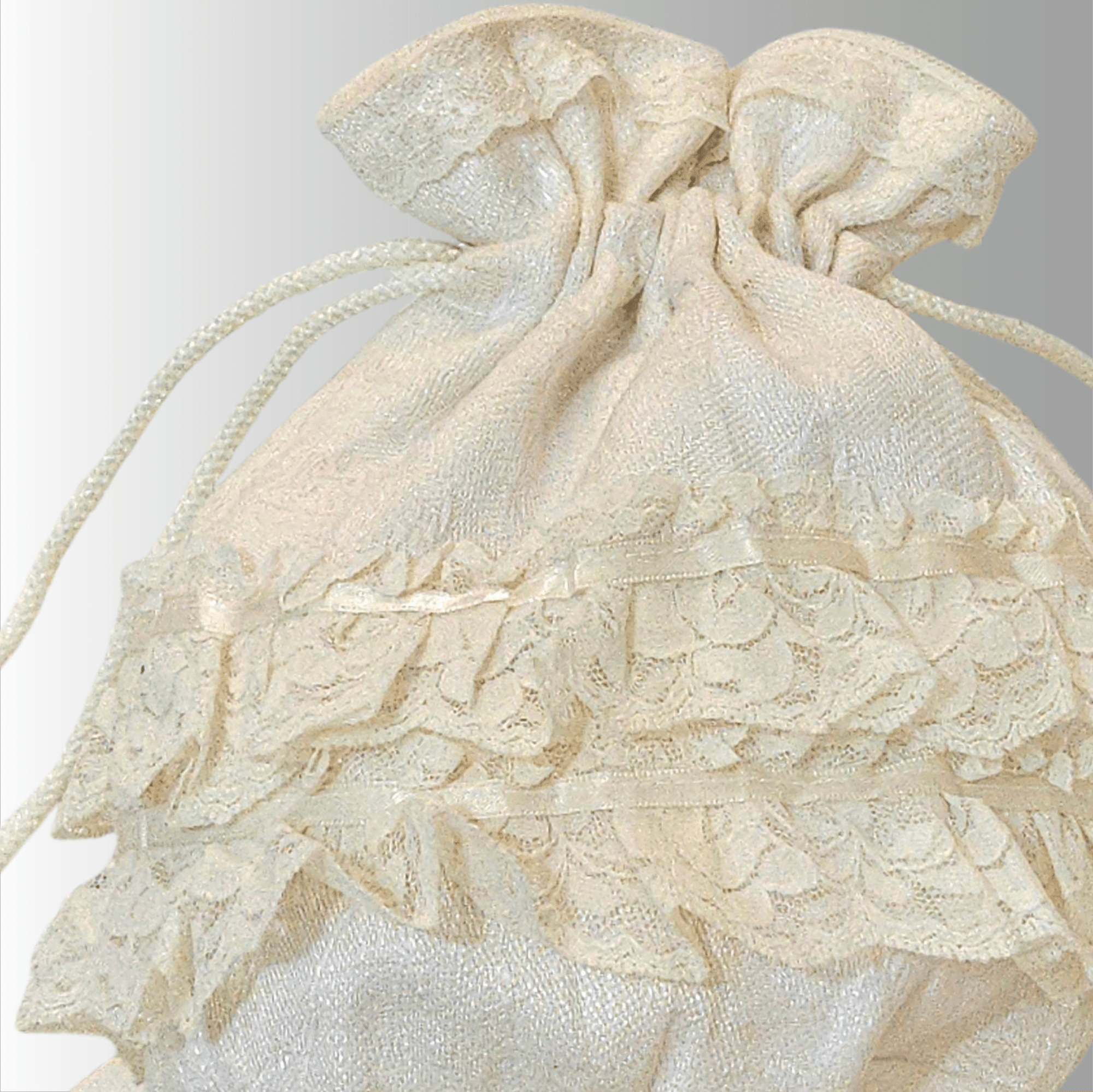 กระเป๋าถุงรูดลูกไม้สีครีมนวล ระบายซ้อนชั้นน่ารักมาก