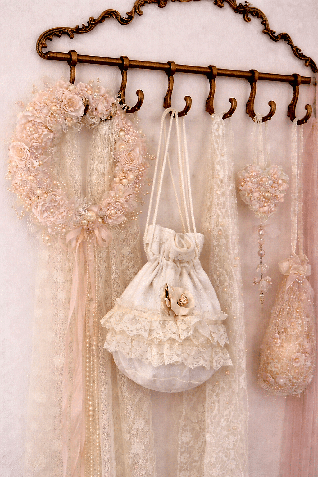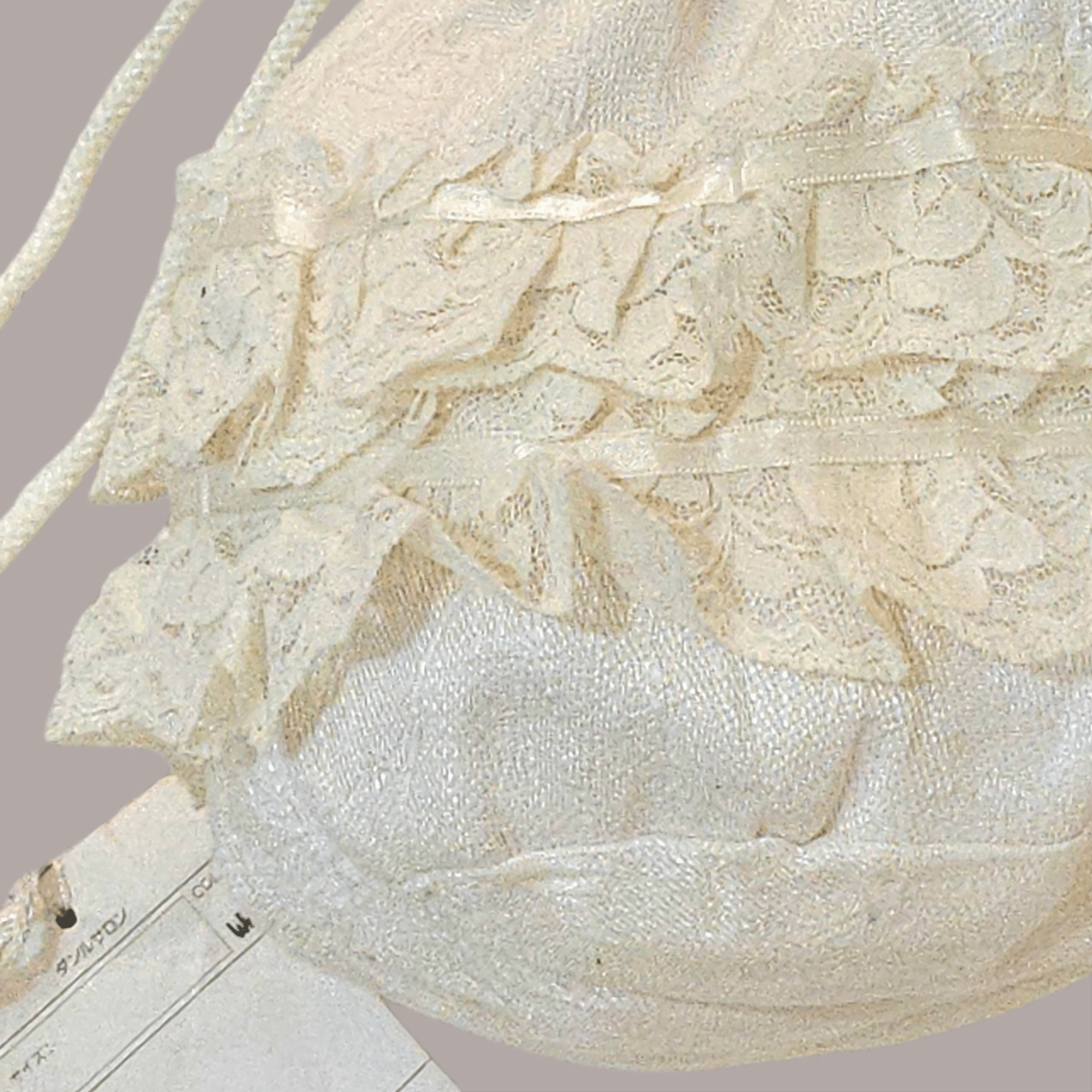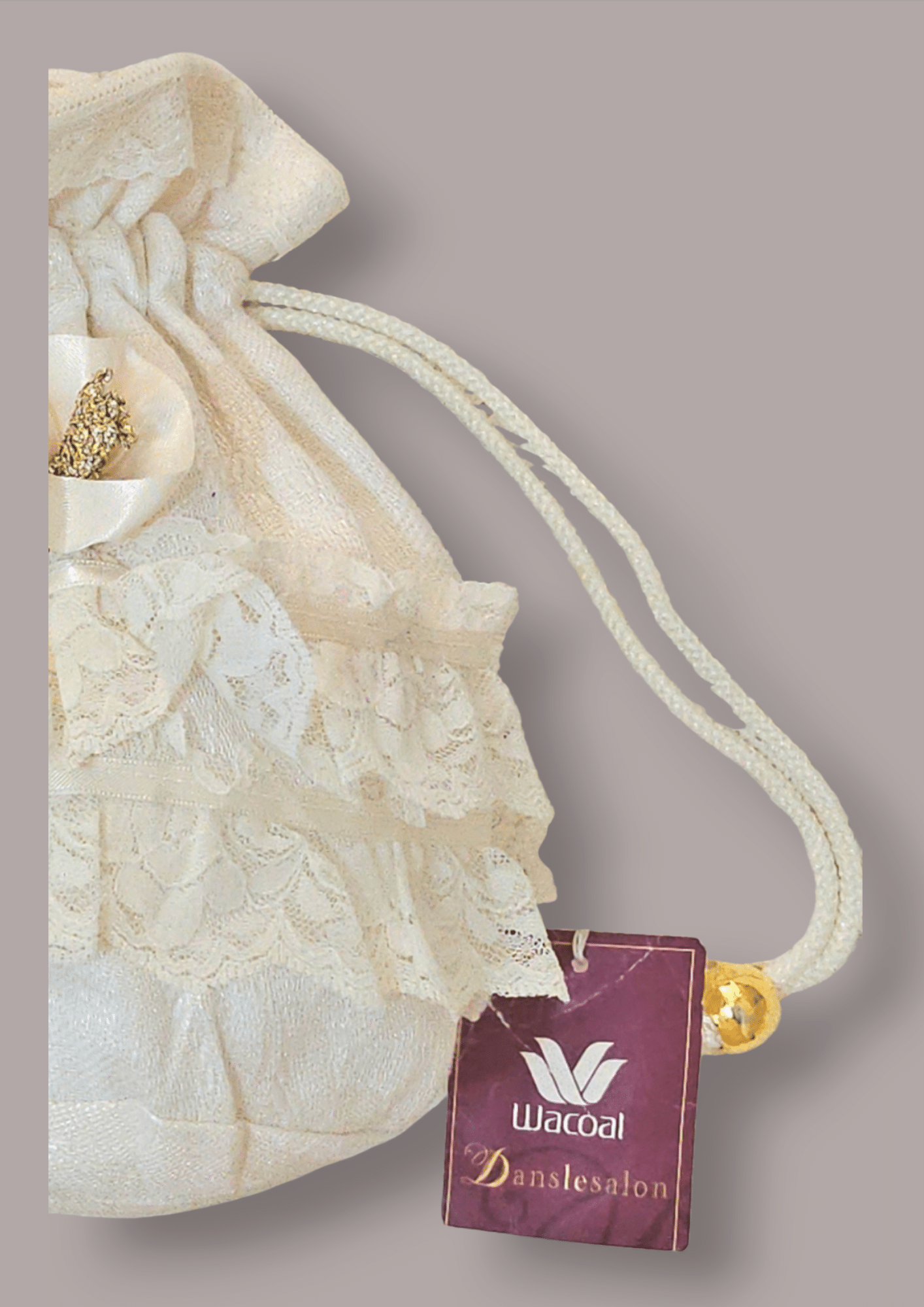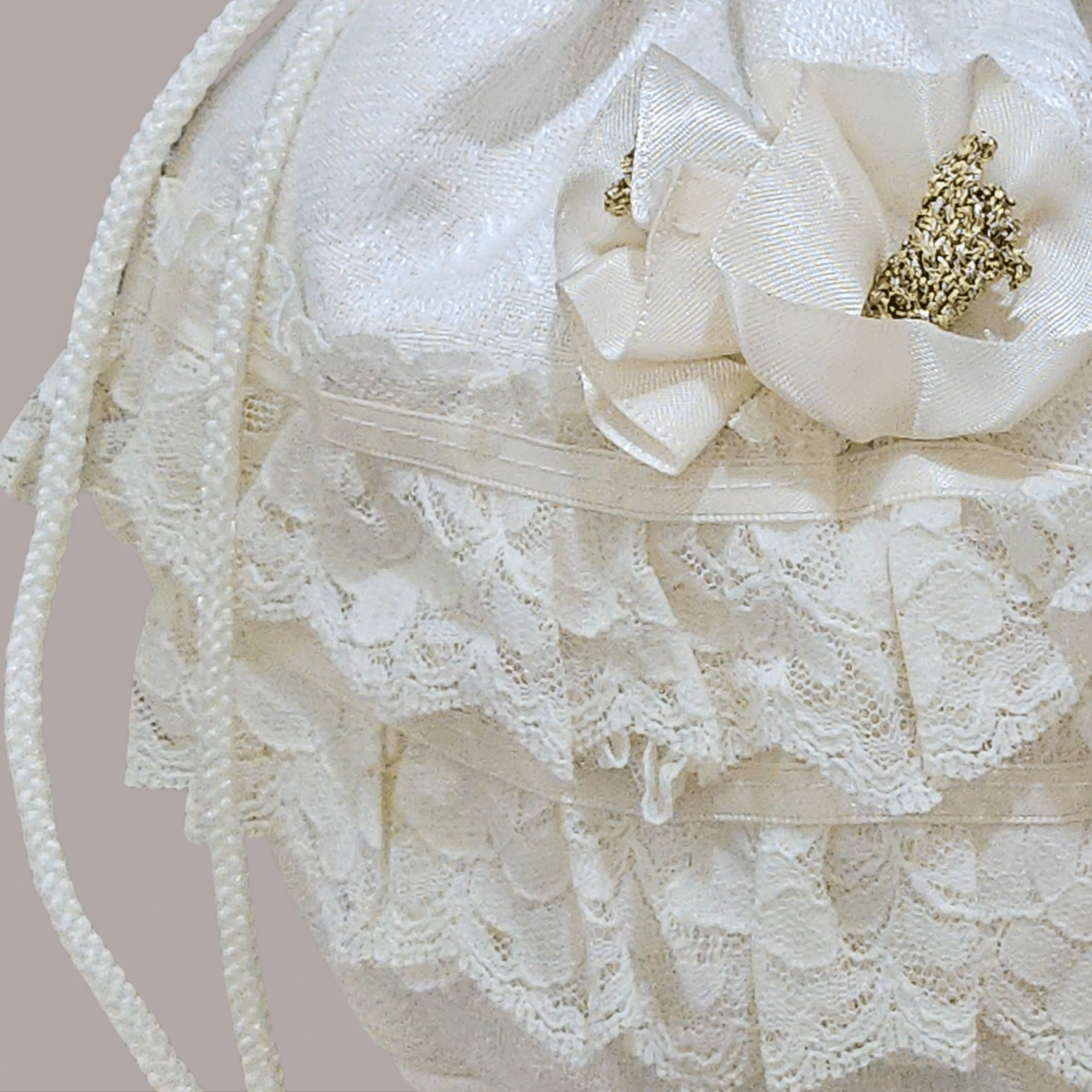 กระเป๋าถุงรูดลูกไม้สีครีมนวล ระบายซ้อนชั้นน่ารักมาก