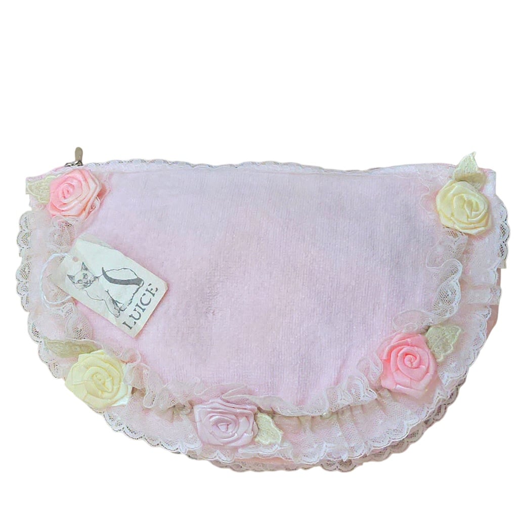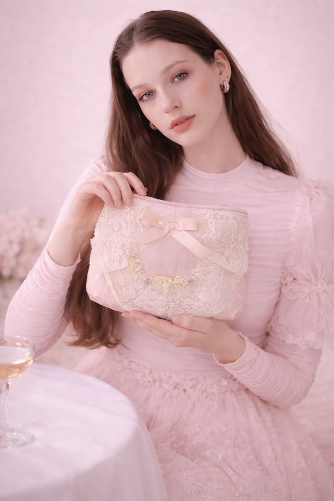 คลัทช์สีชมพูอ่อนแต่งลูกไม้และกุหลาบเล็ก ๆ รอบใบ