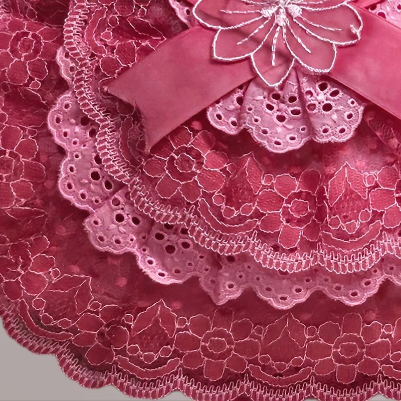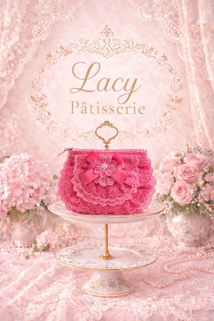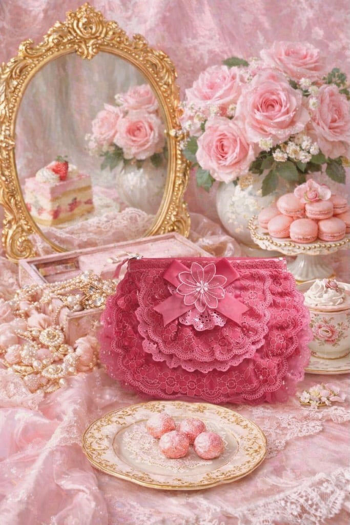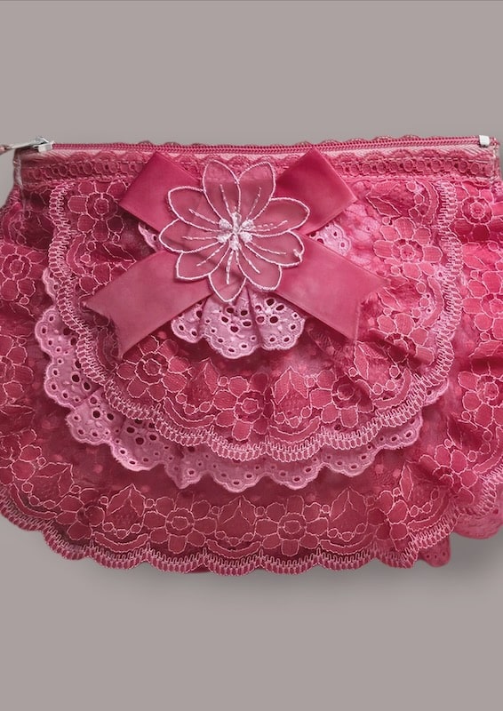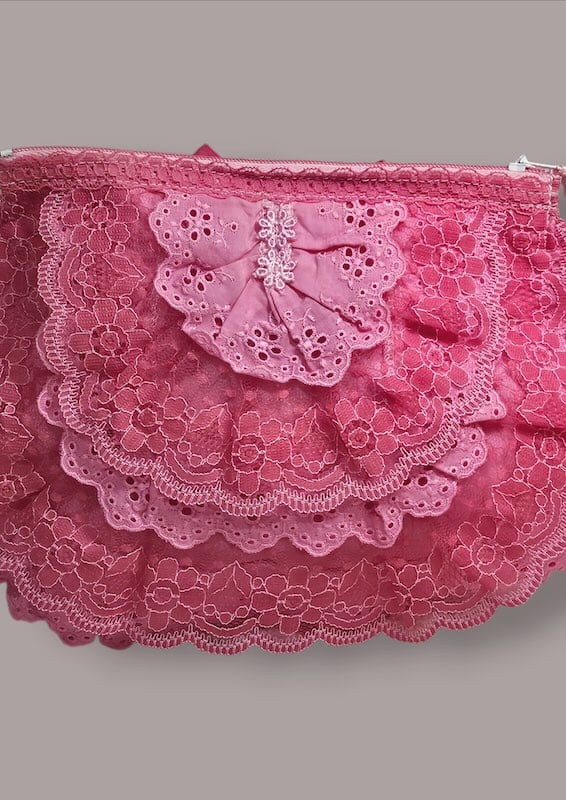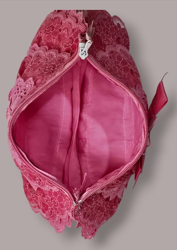 กระเป๋าลูกไม้โทนชมพูหวานละมุน ดีไซน์หรูสไตล์เจ้าหญิง ตกแต่งด้วยดอกไม้และโบว์สุดประณีต